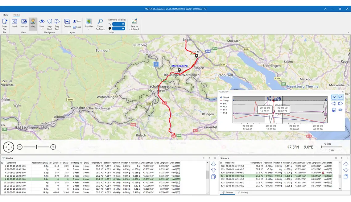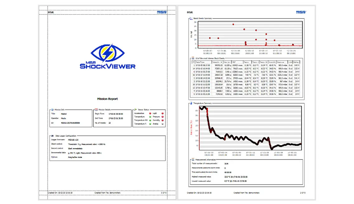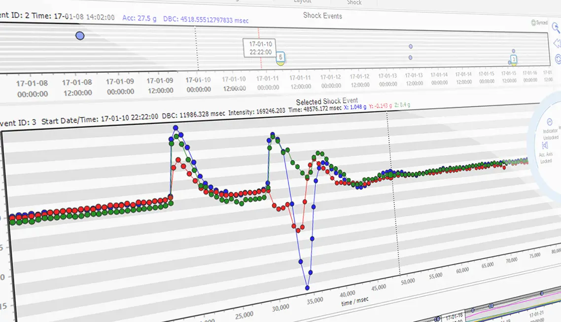 עם לוח המחוונים של MSR, הגדרת המכשיר והורדת הנתונים באמצעות USB הן מהירות ואינטואיטיביות. לקבלת סיכום ברור של נתוני הובלה, MSR ReportGenerator מספק דוחות מיידיים בלחיצת כפתור. לניתוח מעמיק של זעזועים, הגרסה הבסיסית של MSR ShockViewer מאפשרת הדמיה והערכה מפורטות של אירועי זעזועים.