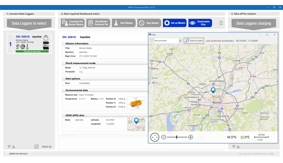 היכן ומתי בדיוק התרחש אירוע במהלך הובלה או אחסון שהיה מחוץ לגבול הסבילות שנקבע מראש? כדי לאפשר לך לענות על שאלה זו במהירות ובאופן חד משמעי, ה-MSR175 plus מצויד במקלט GPS/GNSS (מערכת ניווט לוויינית עולמית). נתוני המיקום הנתמכים על ידי לוויין מאוחסנים על ידי לוגר הנתונים, מה שמאפשר לקבוע ולתעד במהירות את מיקום הפריט המועבר במקרה של נזק.